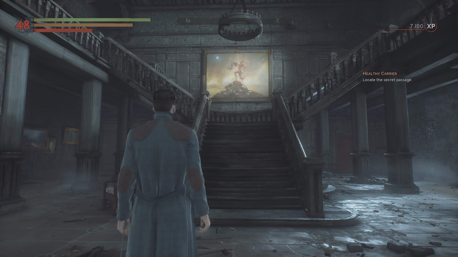 ぐるぐる探索して城壁の穴から中に入れました。大階段の間には怪しい大きな絵画あります。